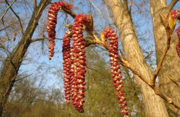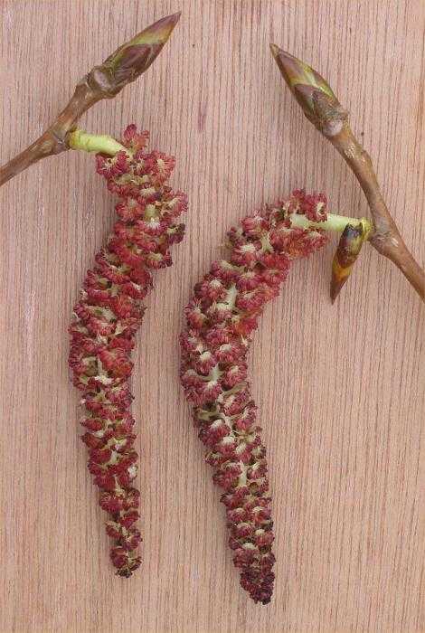 Цветение — длинными сережками, бордовыми и желтыми, мужской и женской разновидности. Мужское и женское цветение отличается окрасом и длиной соцветий, женские соцветия обычно в два раза длиннее и пышнее.