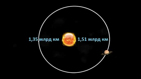 Среднее расстояние от Солнца до Сатурна составляет 1.429 млрд. км. Но большая полуось орбиты Сатурна выполнена в форме эллипса, поэтому планета приближается на 1.35 млрд. км и отдаляется на 1.509 млрд. км.