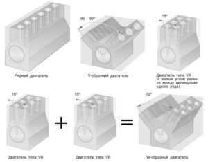 1- рядный; 2 – V образный; 3 – оппозитный; 4 – совмещенный V образный и рядный двигатель; 5 – W образный; 6 – совмещенный в W образной компоновке.