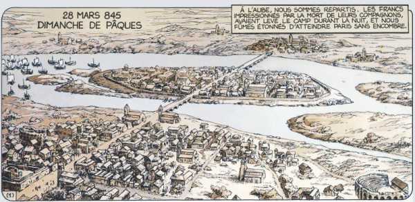 Художественная реконструкция Парижа во время осады 845 года. Источник.