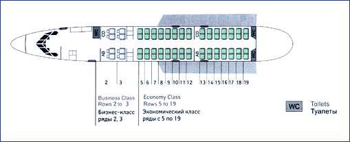 В салоне эконом-класса кресла расположены, как и в бизнесе по типу «2-2», и потому между ними находится широкий проход, не характерный для категории «эконом». Обычно в салоне 14 рядов, но счет начинается с 5. Так что первый ряд эконома расположен под №5, а последний – под №19.