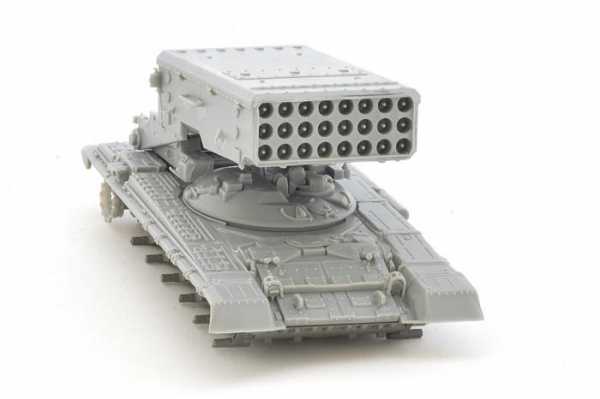 Тяжелая огнеметная система «ТОС-1», предназначена для комплексного поражения целей за счет воздействия высоких температур и избыточного давления. ТОС-1 может передвигаться в боевых порядках мотопехоты и танков, поражать атакующую живую силу противника с открытых и закрытых огневых позиций. В состав ТОС-1 входит боевая машина РСЗО, выполненная на базовом шасси танка, которая содержит пусковую установку (ПУ), включающую поворотную платформу (ПП) с выносными кронштейнами, на которых через оси цапф и опорные кронштейны закреплен транспортно-пусковой контейнер (ТПК) направляющими пусковыми трубами для НУРС. Наведение ПУ на цель в горизонтальной и вертикальной плоскостях производится силовыми следящими приводами от СУО, состоящей из прицела, квантового дальномера (КД), баллистического вычислителя (БВ) и датчика крена.