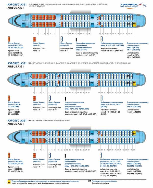 Модель A321 является самым крупным самолетом в семействе Airbus. Модификация самолета A321-200 предусматривает размещение 170 пассажиров, в кабине двух-классового типа: бизнес-класс (28 мест) и эконом-класс (142 места).