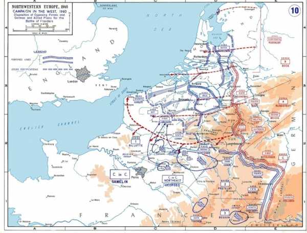 10 мая 1940 года немецкие войска начали масштабное наступление на Голландию, Бельгию и Францию одновременно. Французы и англичане ожидали повторения сценария Первой мировой, когда немцы упрутся в укрепленную оборону на границе Франции и попытаются обойти ее с севера через Бельгию и Голландию, где и были сосредоточены основные силы союзников. Но сумрачный немецкий гений смог обвести их вокруг пальца. На севере был нанесен лишь отвлекающий удар, а основные силы обошли знаменитую, но оказавшуюся совершенно бесполезной французскую оборонительную линию Мажино, и начали стремительное продвижение на юго-запад через Арденны вглубь Франции и на север к Ла-Маншу.