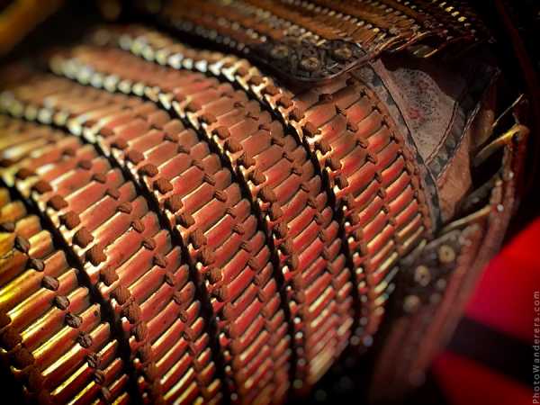 Всякая металлическая пластина покрывалась прокопченной толстой кожей. Для каждого обмундирования из нее изготавливалось несколько кусков, самый крупный из которых прикрывал всю переднюю часть туловища воина. Такая мера была необходима для удобства стрельбы. При использовании лука тетива скользила по броне. Кожа не позволяла ей задевать выступающие пластины. Такая случайность могла многого стоить во время сражения.