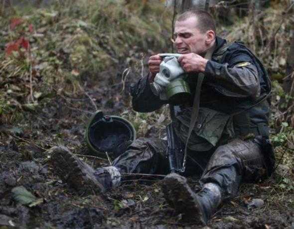 Первым испытанием после марш-броска стал БТР. Добежавшие проползали под БТР, а в это время шел обстрел холостыми патронами.