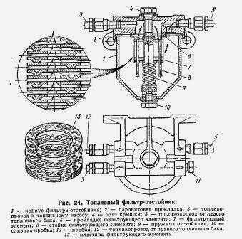 Топливный фильтр-отстойник (рис. 24) установлен на переднем кронштейне топливного бака.