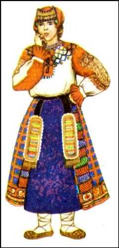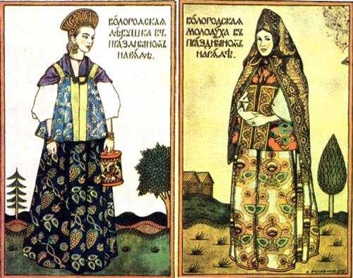 Известный русский художник И. Билибин изобразил девушку из северной деревни. Ее наряд — сарафан клинник и душегрея перо сшиты из покупного штофа с богатым узором. Такую ткань привозили из стран Востока. А вот головной убор венец — русской золотошвейной работы.