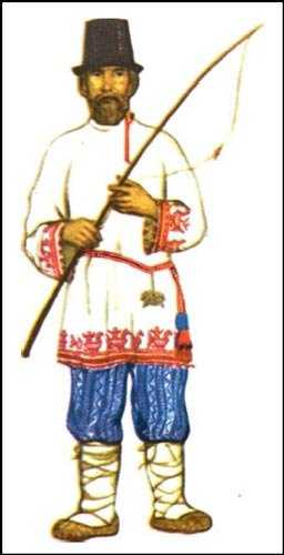Что еще входит в мужской русский народный костюм? Это штаны-порты. Шились они из полосатой ткани желательно синего цвета, были немного укороченными, т.к. заправлялись в онучи или сапоги. Что касается ширины, то чаще они были облегающими, хотя некоторые и носили что-то подобие шароваров. Пока не пришла мода на карманы, к поясу просто привязывали кисет и гребешок.