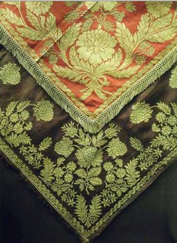 Что еще дополняло основной костюм? С богатым сарафаном надевали для тепла парчовую душегрею, собранную на спине красивыми складками. С рукавами — называлась епанёчка, на лямках — коротенька. Вышитый передник тоже мог иметь рукава, но чаще надевался на шею или повязывался над грудью. Ну и в праздник — красивый платок или шаль, скажем, каргопольский золотой плат с узорами. Таков наряд крестьянок русского Севера.