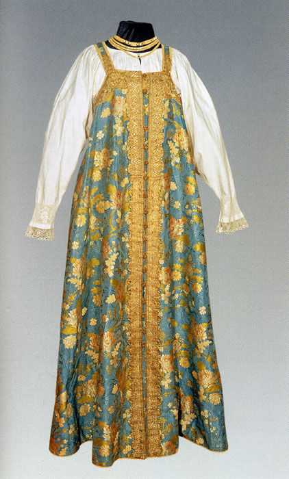 Интересно, что слово «сарафан» впервые встречается на Руси в документах XIV века применительно к мужской одежде. Наиболее древний тип женского сарафана — шушпан со сплошным передним полотнищем. Но уже в прошлом веке его донашивали пожилые крестьянки, а молодежь освоила распашной сарафан, застегивающийся на ажурные металлические пуговицы. Из-за большого числа клиньев, сильно расширяющих его в подоле, он получил название клинник. Впрочем, встречались и другие названия — по ткани: кумашник, набоешник, штофник — ведь клинники шили не только из окрашенной в синий или красный цвет домотканины, но и из покупных материй. Необыкновенно популярен был кумач, который шел на праздничную одежду. На самую же нарядную брали шелковые ткани — атлас и штоф, а в наиболее зажиточных семьях — парчу. Во второй половине XIX века на смену косо-клинному пришел прямой сарафан из пяти-шести полотнищ с узкими лямками: лямошник, круглый, раздувай, москвич, шубка.