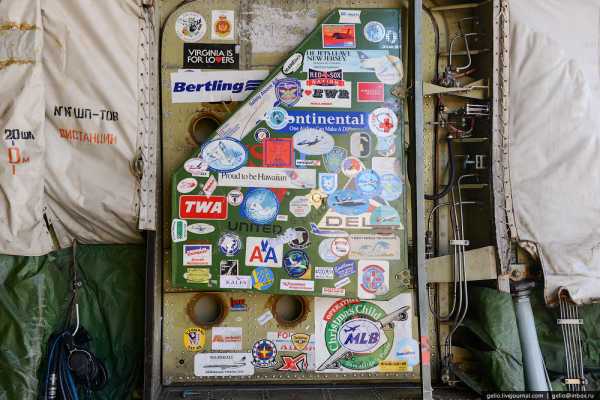 Наклейки – сувениры от многочисленных посетителей на панели на створки люка аварийного покидания самолета.