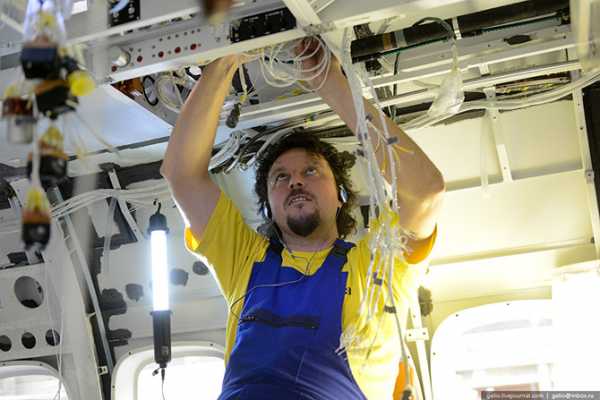 Процесс отделки багажного отделения самолета в носовой части после завершения монтажа электрооборудования