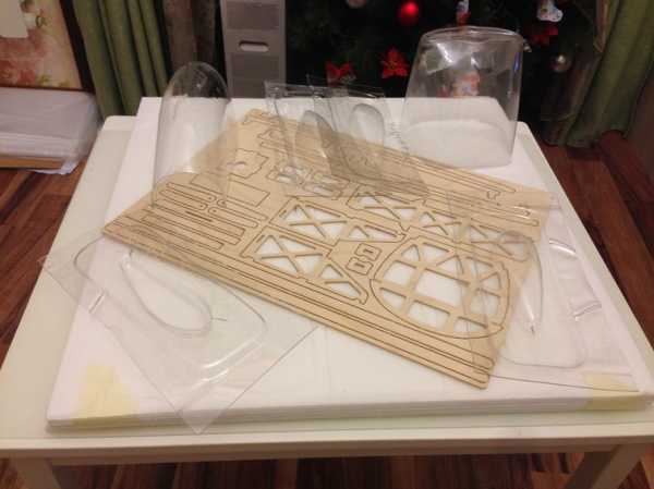 В наборе 6 листов потолочной плитки, лист фанеры с вырезанными деталями для постройки Экстры, фонарь, капот и обтекатели шасси из ПЕТ.