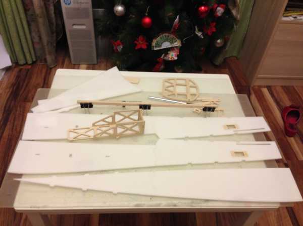 Вклеил киль. Для увеличения жесткости приклеил к задним кромкам киля и стабилизатора карбоновую рейку сечением 3х1 мм. Склеил пеналы для лонжерона из фанеры.