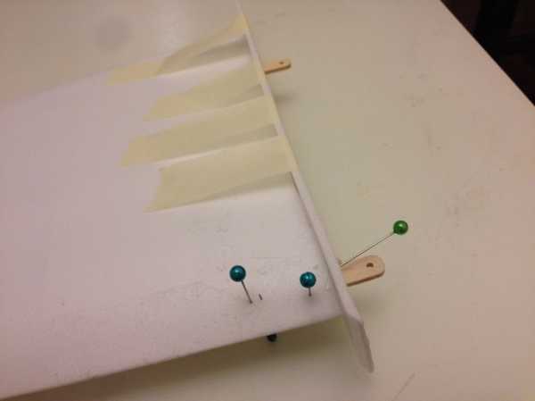 Далее на ранее размеченные места вклеил лонжерон из потолочки и планку, по которой будут отрезаться элероны. Верхнюю и нижнюю панели обшивки консоли крыла по передней кромке склеил скотчем.