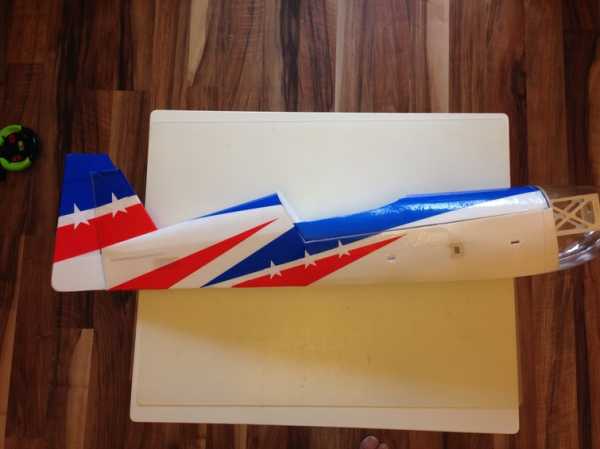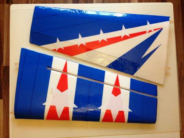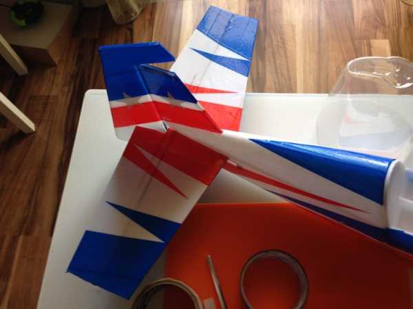 Элероны, руль высоты и руль поворота навесил на скотч. Модель оклеена синим, красным и белым скотчем.