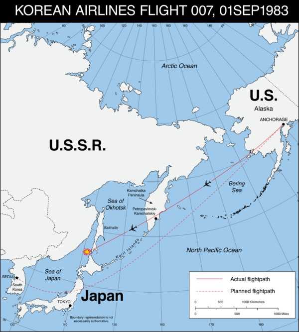 Первый случай, самый известный. Это инцидент с самолетом Боинг-747-230В южнокорейской авиакомпании «Korean Airlines» 1 сентября 1983 года. Боинг, выполнявший рейс КАL007 Нью-Йорк-Анкоридж-Сеул, в течение полета сильно отклонился от заданного курса. Первый раз он вторгся в воздушное пространство СССР над Камчаткой (отклонение от курса составляло 300 км), где на перехват были подняты 6 самолетов МИГ-23 и для него настойчиво передавались предупреждения о нарушении границы.
