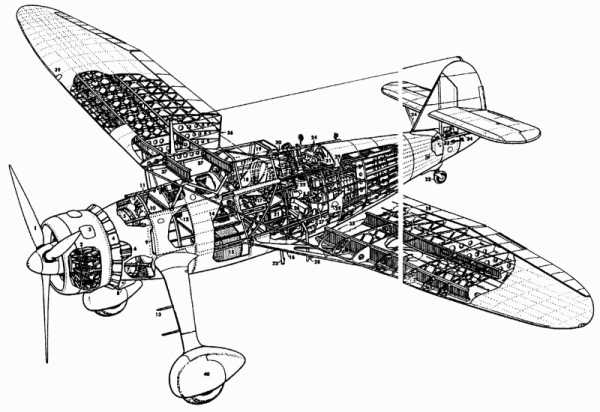 Самолет Хш-126 (фиг. 65) является ближним разведчиком и корректировщиком артиллерийского огня, а также используется для ночного бомбометания. По схеме он представляет собою подкосный моноплан-парасоль с большим вырезом крыла в средней части для улучшения обзора.