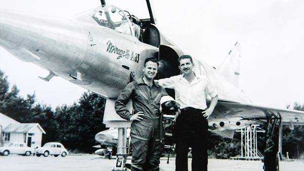 Командующий ВВС Израиля генерал Эзер Вайцман (справа) и Главный лётчик-испытатель ВВС Израиля Дани Шапиро около самолёта «Мираж» IIIA во время испытательных полётов во Франции.