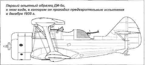 Первый вылет на опытном образце ДИ-6 совершил летчик-испытатель НИИ ВВС А.И. Филин 30 сентября 1934 г. Выполнив несколько «площадок» до высоты 5000 м, он завершил полет подряд четырьмя взлетами и посадками, причем две из них—с уборкой и выпуском шасси. После этого самолет до декабря в воздух не поднимался. За это время на нем заменили мотор, изменили угол установки стабилизатора, отрегулировали уборку и выпуск шасси.
