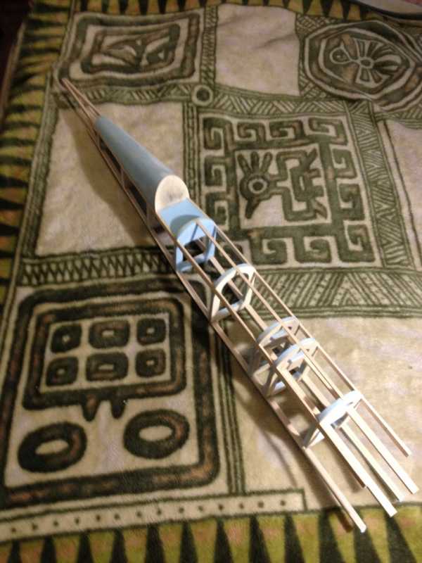 Мал по малу работа продолжалась. На фюзеляже сделан передний шпангоут из 4мм фанеры под мотор, вклеены стойки кабана, под крылья и хвостатая часть фюзеляжа, обшиваться будет миллиметровой бальсой, так же крепление костыля.