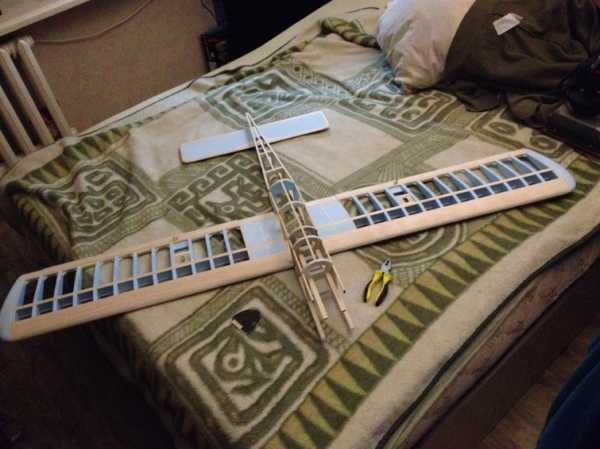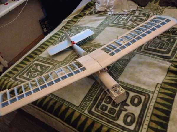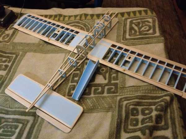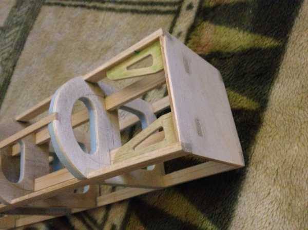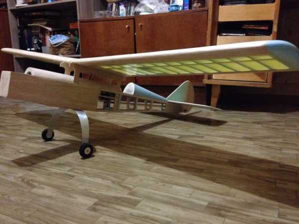 Далее была сделана часть киля, частично обшит фюзеляж (так же сделаны прорези под лючки 2шт. и платформа под стойку шасси), заклеены шпоном крылья в местах скрепления.