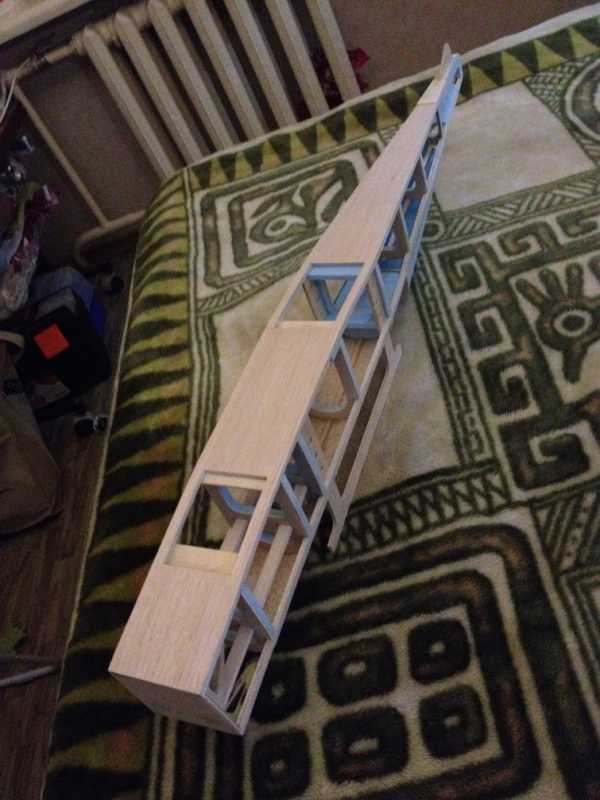 Так же мною было решено использовать фанерные нервюры на законцовках. Лонжероны бальза 5мм, так же имеется усиление передней кромки крыла лонжероном и миллиметровой бальсой. После сборки и склейки крыла, мною были сделаны вставки между лонжеронами и наклеены необработанные заготовки законцовок, с последующей проработкой. После, мною были выполнены элероны (бальса) и петли к ним.