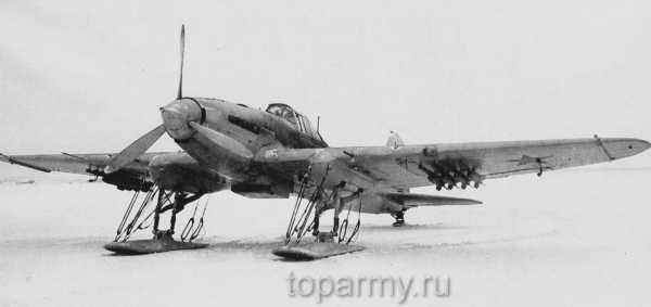 Ил-2 в белом зимнем камуфляже на неубирающемся лыжном шасси с резиновыми растяжками. Такое шасси было надежнее убирающегося, но отнимало до 40 километров скорости
