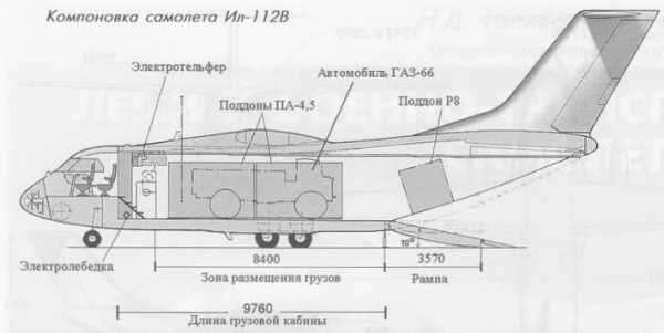 Высота грузовой кабины определилась из высоты заданного в ТЗ требования перевозить двигатель Д-ЗОКП (для самолета Ил-76МД, Ил-78) в контейнере. Этот груз имеет высоту 2050 мм. Токую же высоту имеет и автомобиль УАЗ-469, но в отличие от двигателя в контейнере, он может загружаться в самолет своим ходом. Двигатель же можно загрузить в самолет только с помощью специальной наземной техники при условии, что контейнер с двигателем будет размещен на авиационном поддоне. Или для загрузки контейнера с грузом необходимо на борту самолета иметь потолочную механизацию по типу потолочной механизации самолета Ил-76, т. е. на самолете Ил-112В необходимо иметь тельферное оборудование, способное загрузить в самолет груз максимальной массой 6 т.