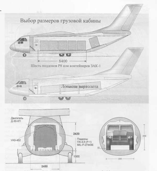 В авиационном мире широко применяются авиационные контейнеры, имеющие в основании поддон с размерами 88″×96″ (2235×2438,4 мм) и 88″×125″ (2235×3175 мм). А это значит, что размер грузовой кабины по ширине должен быть не менее 2235 мм. Если установить по этому размеру конструкцию боковых упоров-направляющих для контейнеров и поддонов, то получается размер минимум 2450 мм. Теперь, что касается высоты грузовой кабины. Во всем мире уже давно широкое применение нашла аэродромная техника, отвечающая американской системе погрузочно-разгрузочных работ «4631», которая используется для загрузки в самолет авиационных контейнеров и поддонов. Причем практически такая же техника применяется в армиях стран НАТО.