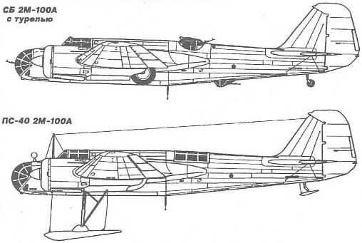 СБ 2М-100 Первая серийная модель. Площадь крыла была увеличена до 56,7 м², нормальная полётная масса до 5628 кг, что привело к снижению максимальной скорости до 393 км/ч. На самолёт были установлены двигатели Климова М-100 (выпускаемые по лицензии двигатели «Испано-Сьюза» 12Y).