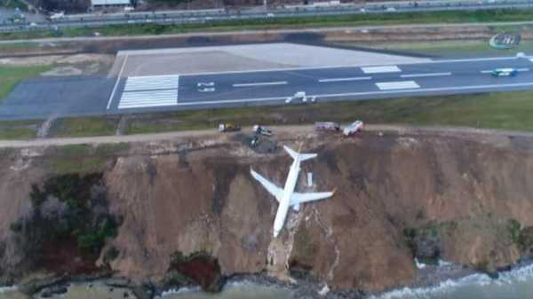 В Сети появилось видео из турецкого Трабзона, где пассажирский самолет выкатился за пределы взлетно-посадочной полосы и застрял в грязи на краю обрыва.