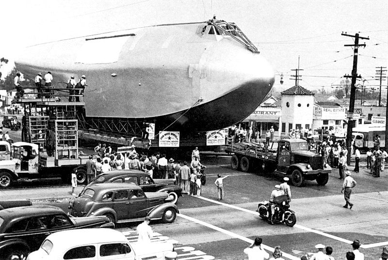 Переезд был крупной операцией. Экипажи подготовили маршрут для этого гигантского груза, сняв более 2000 телефонных и силовых кабелей. Корпус, крылья, оперение и рулевые поверхности размещались на огромных трейлерах. Ползя со скоростью 2 мили в час, колонне потребовалось два дня, чтобы завершить 28-мильное путешествие до острова Терминал, Лонг-Бич. Школьников отпустили с уроков, и толпы людей выстроились вдоль дорог, чтобы стать свидетелями необычного зрелища.