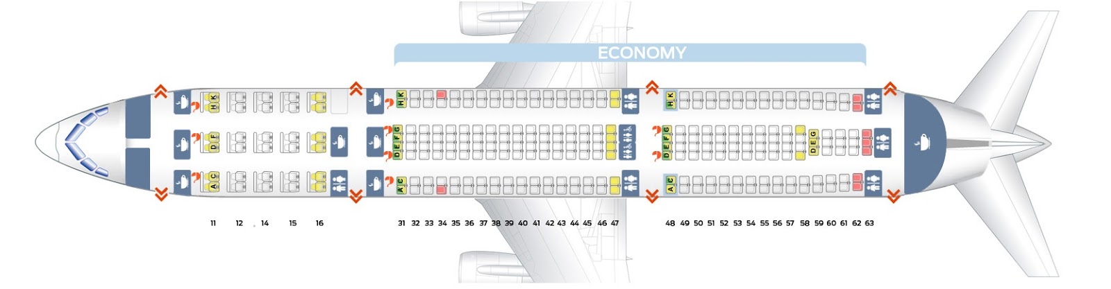 Тем не менее, я бы выбрал для этого салона 21A и 21K, потому что они находятся ближе всего к передней части салона, что обычно означает более быстрое обслуживание, и у них больше всего места для ног из всех обычных кресел эконом-класса — единственный недостаток заключается в том, что сиденья находятся на крыле, а это означает, что вид не идеален. Ряд 36 также имеет дополнительное пространство для ног, так как он расположен в ряду выхода в начале заднего салона эконом-класса, поэтому 36A и 36K будут вторыми местами. Вид из окна лучше, чем в ряду 21, но основным недостатком этих мест является то, что они находятся прямо посередине передней и задней кухни, а это означает, что пассажиры в этом ряду, вероятно, будут ждать дольше всего, пока им подадут еду.