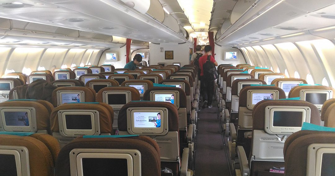 Самолет А330-300 оснащен комфортабельным салоном класса эконом на 387 посадочных мест. Общее количество рядов – 52. Кресла расположены по схеме 2х4х2. Между 11-14 и 34-35 рядами находятся аварийные выходы. В этих промежутках также установлены туалеты и технические помещения. Еще несколько санузлов, кухни и помещения для персонала расположены в носовой и хвостовой части лайнера.