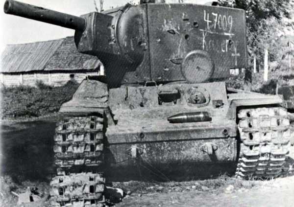 Танк КВ-2 из состава 6-го танкового полка 3-й танковой дивизии 1-го механизированного корпуса, подбитый в бою за город Остров 5 июля 1941 года. На броне следы от многочисленных попаданий, правый борт разворочен крупнокалиберным снарядом, ствол орудия пробит.