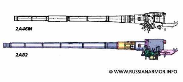 До недавнего времени основной отечественной пушкой были версии хорошо известного танкового орудия 2А46М. Самая последняя модификации 2А46М-5 имеет точность стрельбы на 15-20% выше, суммарное рассевание при стрельбе с хода снизилось в 1,7 раза. Благодаря доработкам орудие приобрело способность вести стрельбу новыми бронебойно-подкалиберными снарядами повышенного могущества.