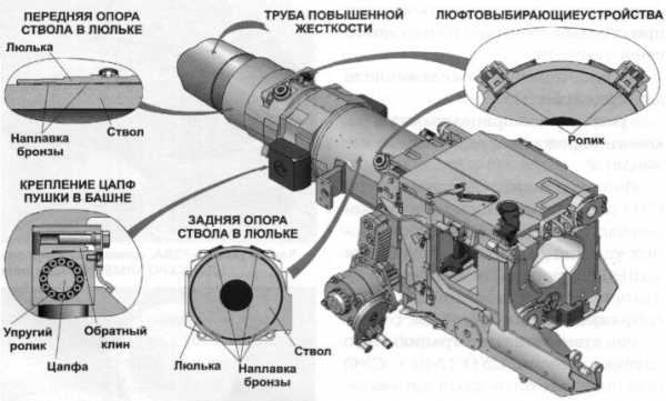 Введено крепление цапфенных обойм в башне обратным клином. Задняя опора откатных частей размещена в обойменной части люльки. Горловина люльки удлинена на 160 мм. В горловине люльки, жесткость которой увеличена, размещены два дополнительных люфтовыбирающих устройства. Обе направляющие люльки выполнены по типу призмы.