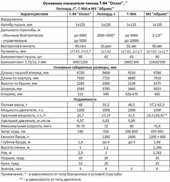 Для справки, ТТХ основных современных танков выглядят следующим образом