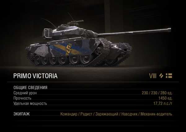 Внешне, «швед» напоминает любимый многими танк Centurion I, что впрочем, неудивительно, учитывая, что Primo Victoria создавался на базе этой машины и является Primo Victoria — STRV 81. Однако это разные танки с индивидуальным характером и боевыми возможностями. Поэтому предлагаем гайд по Primo Victoria от WoT-info. ru, где рассмотрим основные характеристики и особенности нового танка.