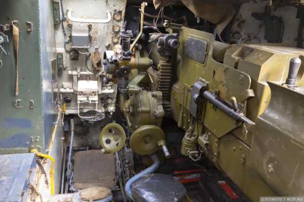 7. С другой стороны от орудия располагался командир (обратите внимание на смотровые щели в небольшой башенке в крыше боевого отделения). За его спиной находился «замковый» и вторая часть боеукладки снарядов. Так же на фото видна рукоятка открытия замка клин-затвора орудия.