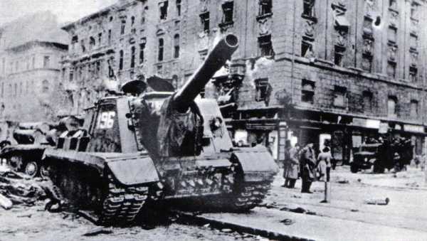 Бронетехника и артиллерия 1-го Белорусского фронта на улице Франкфуртер Аллее (Frankfurter Allee) в Берлине. В центре и слева танки Т-34-85, рядом тягач с 203-мм гаубицей Б-4 на прицепе. В кадре четыре тяжелых танка ИС-2, возле легковушки стоит САУ ИСУ-152.