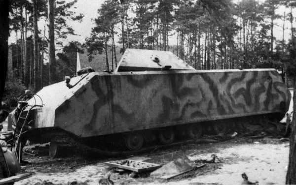 «В городке мы захватили три громадных танка. Люки были открыты, внутри все в порядке, даже боеприпасы подготовлены к бою – с них снята заводская смазка. Танки были так велики, что даже “Королевский Тигр” показался бы рядом с ними танкеткой. Башня плоская, как блин. Вооружён танк 155-мм пушкой. На вид очень внушительная машина, но, проведя аналогию с “Королевским Тигром”, я уверен, что его ходовые качества были низкие».