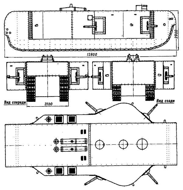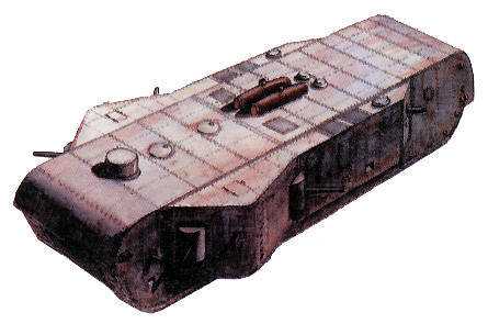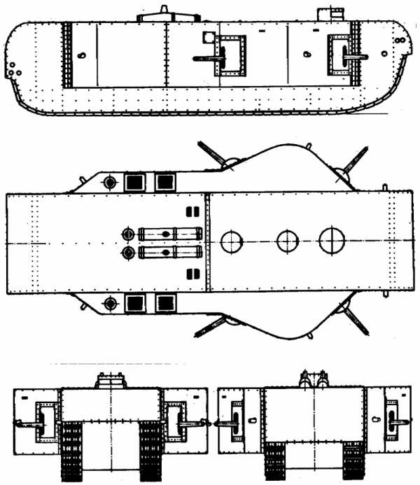 | проект 100-тонного «Летающего слона», разработанный еще в 1916 году, остался нереализованным. Вагонообразный корпус «танка-слона», опиравшийся на две гусеницы, кроме того был снабжен парой гусениц под днищем для предотвращения «вывешивания» машины на препятствиях. |