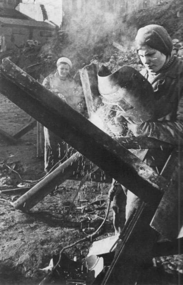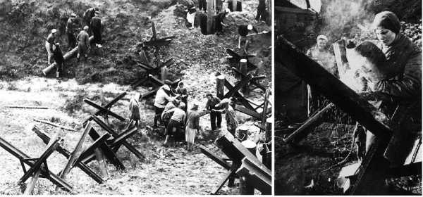 Изготовление противотанковых ежей на окраине Москвы.