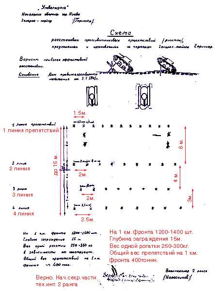 Заключение: «Комиссия считает, что противотанковые препятствия шестиконечные звездочки являются эффективным противотанковым заграждением, это вид заграждения можно широко применять в районе УРов, дефиле и особо важных направлениях».