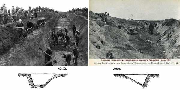 Недостатком рвов в виде неравностороннего треугольника и неправильной трапеции является то, что пехота противника может, накапливаясь в них, использовать их как прикрытие и танки могут войти в него. Но объем работ значительно меньше, чем при постройке рвов равносторонних и трапецеидальных.