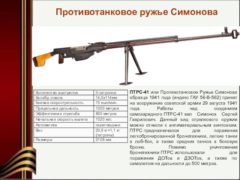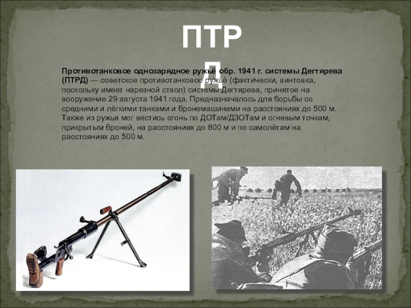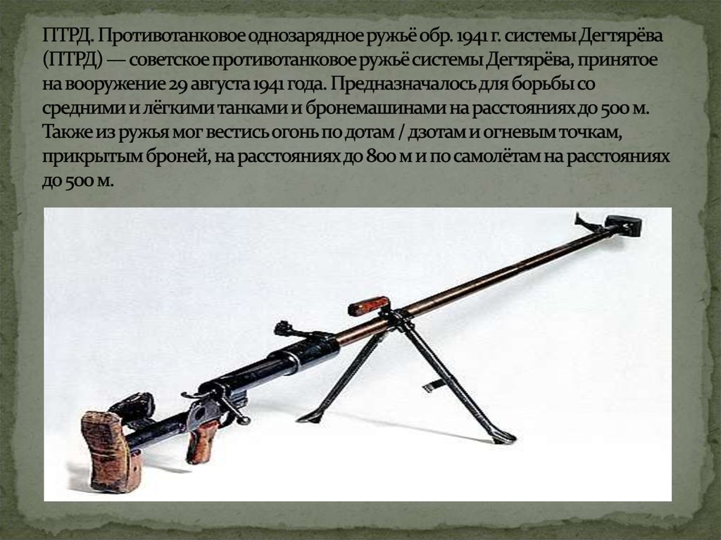 Самые ранние противотанковые ружья — «Танкгевер M1918» — применялись в конце Первой мировой войны немцами против английских и французских танков. Эти ружья продемонстрировали крайне низкую эффективность — с помощью ПТР было уничтожено всего 7 французских танков. Относительной простоте изготовления ПТР, подвижности расчёта и удобства маскировки огневой точки соответствуют также и низкая эффективность этого вида оружия. Тем не менее, наиболее совершенные модели противотанковых ружей, например советские ПТРС, применялись вплоть до конца Второй мировой войны.