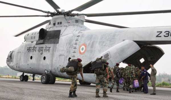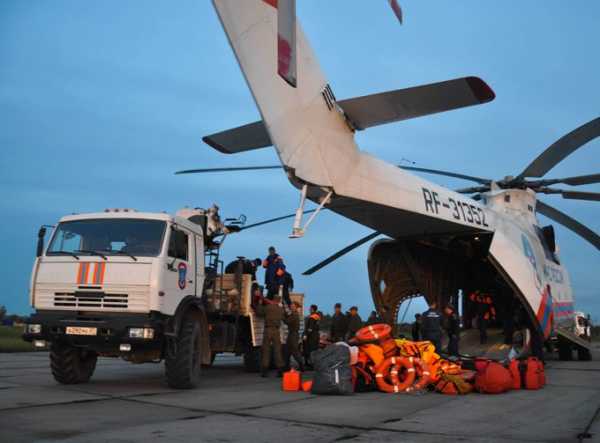 Вертолет Ми-26 перевозит другой вертолет на тросах